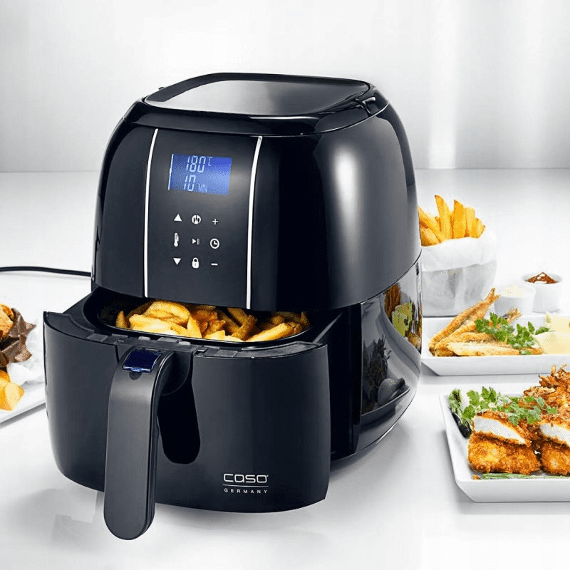 Фритюрниця потужністю 1400 Вт від Caso Germany з технологією циркуляції гарячого повітря, світлодіодним дисплеєм, таймером і функцією автоматичного вимкнення.