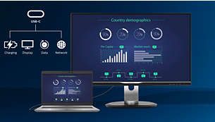 Цей монітор Philips має вбудовану док-станцію USB Type-C з функцією живлення. Завдяки розумному та гнучкому керуванню живленням ви можете заряджати сумісний* ноутбук безпосередньо від монітора. Тонкий двосторонній роз'єм USB-C дає змогу легко під'єднати док-станцію за допомогою одного кабелю. З його допомогою до док-станції для монітора можна підключити всі периферійні пристрої, такі як клавіатура, миша та кабель Ethernet RJ-45. Ви можете переглядати відео високої чіткості та швидко передавати дані, а також одночасно живити або заряджати ноутбук.