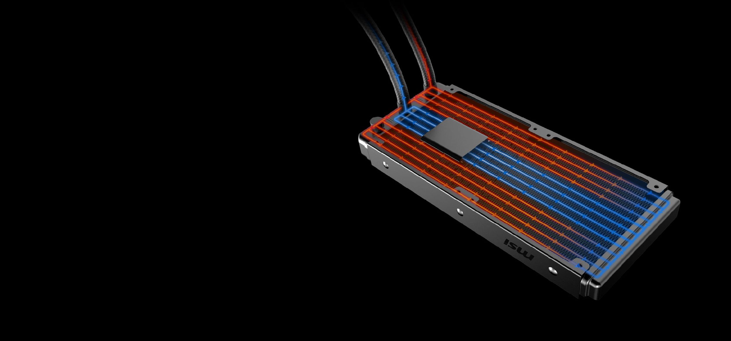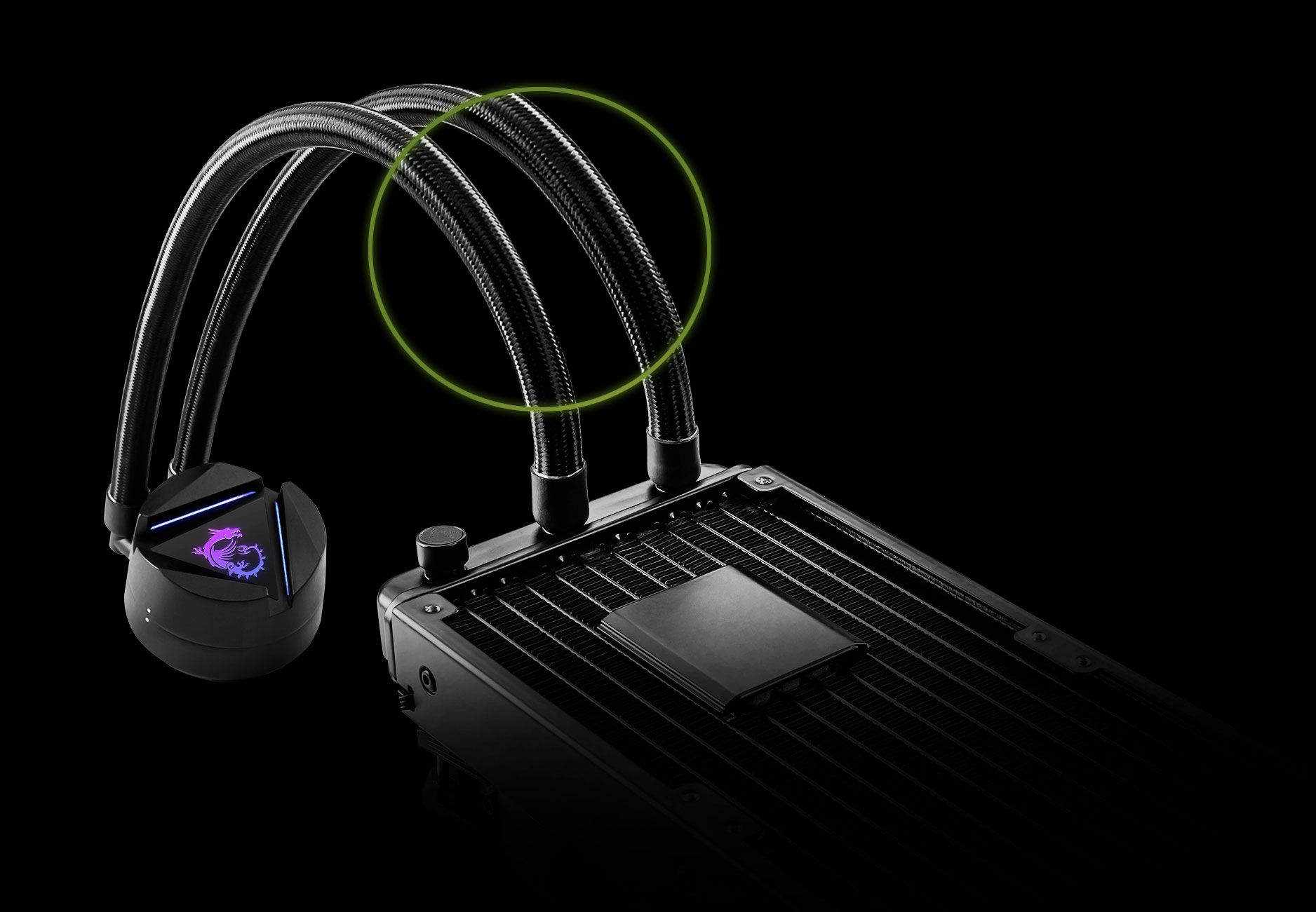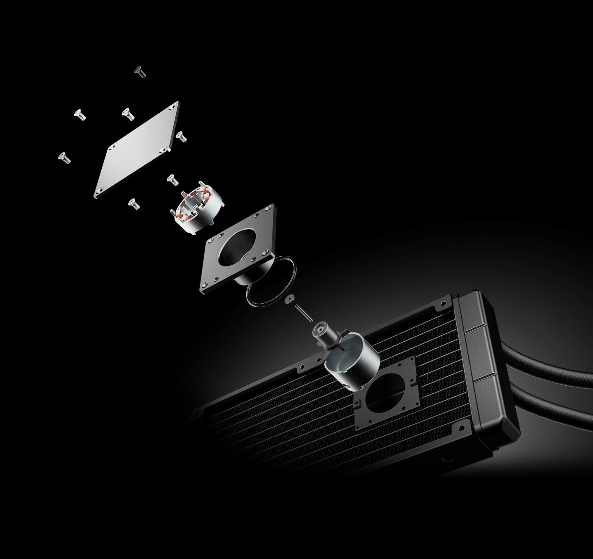 Насос інтегровано в радіатор, щоб приглушити звуки, які він видає під час роботи, і знизити рівень шуму. Крім того, розміщення насоса всередині конструкції радіатора також збільшує термін служби насоса, віддаляючи його від джерела тепла.